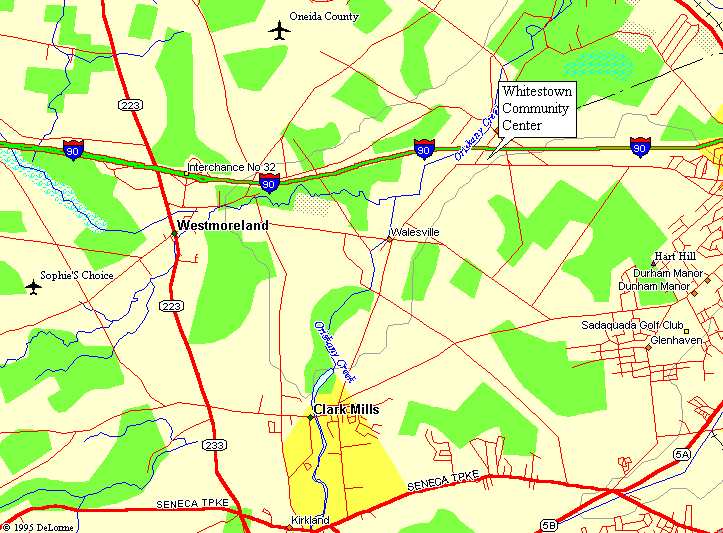 Exit Thruway at Exit 31. Follow Genesee St. (South) sign after toll booth. Curve around under highway, and take right at stop sign onto Genesee St. South. Right after next traffic signal and right onto Oriskany St. West. Continue several miles, thru Utica, Yorkville, and Whitesboro, look for traffic light past diner and firehouse. Turn left left onto Westmoreland Rd, continue several miles to traffic light at Judd Rd. intersection. Proceed thru intersection, and rink is on right.