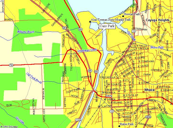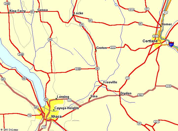 At A&W, NY 281 turns into NY 13. Continue ahead on NY 13 to Dryden. Turn right at the light (the old Brooklyn Diner) just past the Burger King, and continue on NY 13, down the eastern shore of Cayuga Lake into Ithaca.
