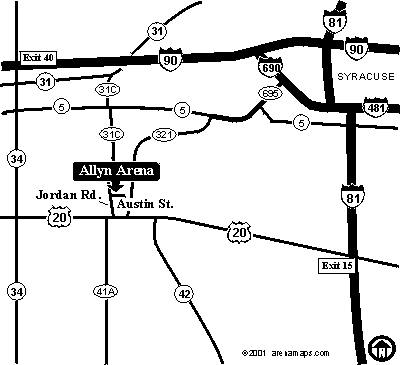 Take the NY Thruway Westbound (I-90) to exit 39. After the toll booth, take I-690 Eastbound to NY 695 (Auburn Exit). Take NY 695 to the end. Stay on the right for NY 5. follow NY 5 West approx 2-3 miles to NY 321 (a blinking yellow light at the top of the hill, and two gas stations).